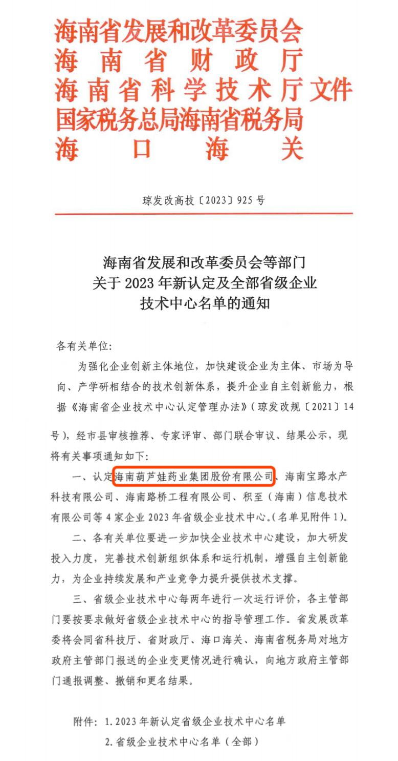 近日,海南省发改委等多部门联合公布了《关于2023年新认定及全部省级企业技术中心名单的通知》,其中,海南blb百乐博药业集团股份有限公司成功通过评审,被认定为省级企业技术中心,是本次获批的4家企业之一。